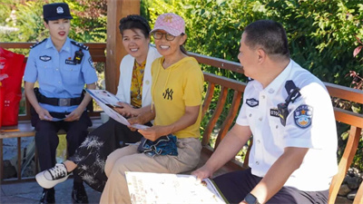 “老哥啊,村里治安咋樣?大伙兒生意還好做不?”8月28日上午,在烏蘭浩特市烏蘭哈達(dá)鎮(zhèn)三合村步行街的涼亭里,有著38年工齡、身著白警襯的興安盟公安局二級高級警長朱治民正和村民圍坐在一起拉家常,話語里帶著熟絡(luò)和親切。這時,恰巧有幾位游客路過,朱治民起身招呼:“是外地來旅游的吧?這邊小路多,孩子容易走丟,可得多留意。咱出來玩,隨身帶的手機、錢包這些貴重物品要收好,別隨手放在石凳上,安全第一嘛!”