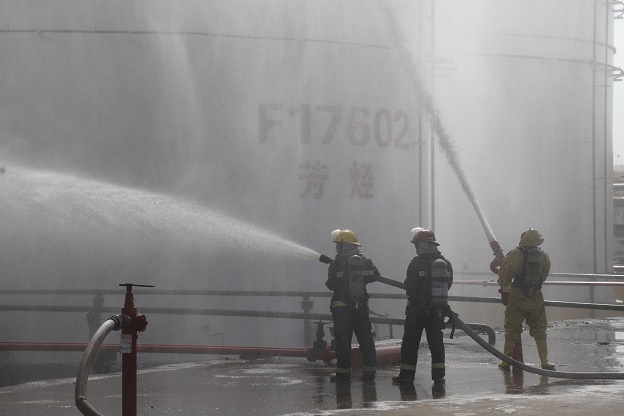 模擬事故發(fā)生在8月22日15時,慶華集團(tuán)精細(xì)化工2名巡檢員對芳烴罐區(qū)進(jìn)行例行檢查時,發(fā)現(xiàn)有芳烴泄露,因吸入過多芳烴氣體而相繼昏迷暈倒,而就在相鄰罐區(qū)還有10名操作工人正在作業(yè),隨后不久,儲罐區(qū)泄漏芳烴在靜電作用下引發(fā)火災(zāi),并且火勢很快蔓延至整個罐區(qū),由于事態(tài)嚴(yán)重,化工廠在迅速自救的同時即刻向119、110、120報警。在消防、醫(yī)護(hù)人員的救援救助中,火情得到了控制,人員得到了救助。