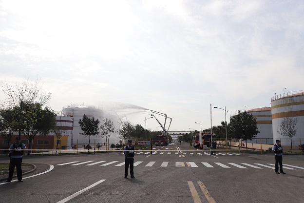 此次演練以慶華集團(tuán)精細(xì)化工芳烴儲罐泄露著火事故為背景,主要圍繞應(yīng)急處突、火情控制、人員救護(hù)、外圍安保、交通管控、現(xiàn)場勘查及各單位應(yīng)急聯(lián)動情況展開演練。