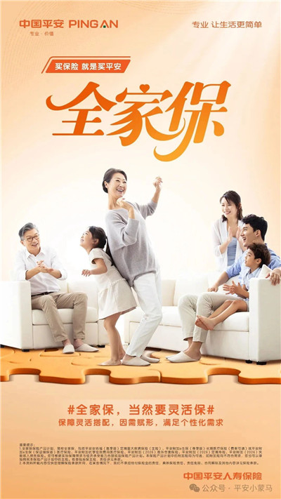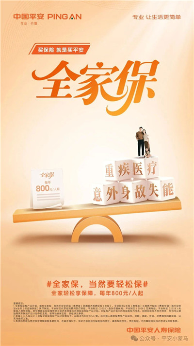 ①全家保保險(xiǎn)產(chǎn)品計(jì)劃,簡稱全家保,包括平安安佑福(惠享版)定期重大疾病保險(xiǎn)(主險(xiǎn),簡稱安佑惠享定期)、平安附加e生保(尊享版)長期醫(yī)療保險(xiǎn)(費(fèi)率可調(diào))(簡稱e生保尊享版)或平安附加e生保(保證續(xù)保版)醫(yī)療保險(xiǎn)(簡稱e生保續(xù)保版)、平安附加優(yōu)享住院費(fèi)用醫(yī)療保險(xiǎn)(簡稱優(yōu)享醫(yī)療)、平安附加意外傷害醫(yī)療保險(xiǎn)(B)(簡稱意外醫(yī)療B )、平安附加(2026)意外傷害保險(xiǎn)(簡稱附加意外26)、平安附加(2026)定期壽險(xiǎn)(簡稱附加定壽26)、平安附加少兒(2021)定期壽險(xiǎn)(簡稱少兒定壽21)、平安附加(2026)失能收入損失保險(xiǎn)(簡稱附加失能26)。您可根據(jù)實(shí)際保障需求與經(jīng)濟(jì)承受能力合理規(guī)劃保險(xiǎn)產(chǎn)品計(jì)劃。本保險(xiǎn)產(chǎn)品計(jì)劃中的附加險(xiǎn)均為可選,如附加險(xiǎn)均不符合需求,您也可以單獨(dú)購買本保險(xiǎn)產(chǎn)品計(jì)劃中的主險(xiǎn)。若單獨(dú)投保主險(xiǎn),責(zé)任詳見條款。②本文所稱重疾指安佑惠享定期合同約定的120種重疾,等待期90天。發(fā)生合同條款約定的重疾按100%基本保險(xiǎn)金額給付重疾保險(xiǎn)金。重疾保險(xiǎn)金限給付1次,給付后身故金不再給付。③百萬醫(yī)療保障由e生保尊享版提供。具體責(zé)任詳見條款。保額400萬指e生保住院醫(yī)療保障最高400萬。④住院費(fèi)用保險(xiǎn)金由優(yōu)享醫(yī)療提供。給付被保險(xiǎn)人因意外傷害或30天等待期后因疾病經(jīng)醫(yī)院診斷必須住院治療的,符合條款約定的住院醫(yī)療費(fèi)用。本附加險(xiǎn)的年度給付限額為1萬元。具體責(zé)任詳見條款。⑤家庭(2人及以上)投保全家保保險(xiǎn)產(chǎn)品計(jì)劃情況下,起保點(diǎn)為800元/人/年。其中每人具體保費(fèi)受產(chǎn)品組合、保額、年齡、性別、交費(fèi)期等因素影響,以實(shí)際投保為準(zhǔn)。⑥本文所載內(nèi)容僅供您理解保險(xiǎn)條款所用,在某些情形下,我們不承擔(dān)給付保險(xiǎn)金的責(zé)任。具體保險(xiǎn)責(zé)任、責(zé)任免除、合同解除及其他內(nèi)容詳見保險(xiǎn)條款。