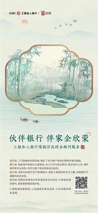 家庭是社會組織關(guān)系的基本單元,企業(yè)則是中國經(jīng)濟發(fā)展的微觀個體。工銀私人銀行始終肩負“家、企、天下”的責(zé)任和擔(dān)當(dāng),立足新發(fā)展格局下企業(yè)和企業(yè)家客戶的金融服務(wù)需求,為企業(yè)家提供高質(zhì)量金融服務(wù),與企業(yè)家一路同行,攜手并進,承擔(dān)社會責(zé)任、創(chuàng)造社會價值,共同服務(wù)國家戰(zhàn)略。