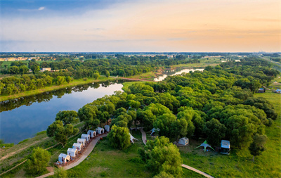呼和浩特市玉泉區(qū)大黑河郊野公園“清嶼林夕房車營地”與朵朵白云相映成趣,構成一幅愜意的郊野畫卷。(攝影:丁根厚)