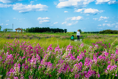 呼和浩特市玉泉區(qū)大黑河郊野公園觀光帶內,繽紛花海與藍天白云相映成趣,景美如畫。(攝影:丁根厚)